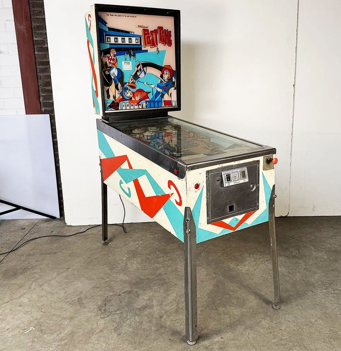 Williams Post Time flipperkast uit 1969. Momenteel niet speelbaar – hij licht niet op wanneer hij aan staat. De kast verkeert in goede, originele visuele staat, hoewel de achterklep ontbreekt. De achterruit is in zeer goede staat en vertoont geen verfverlies. Het speelveld is in goede staat, met slechts lichte slijtage, en ook de behuizing is in goede staat met de gebruikelijke gebruikssporen. De kast is afgesloten en de sleutels ontbreken. Hij zou met minimale inspanning weer speelbaar moeten zijn. Afmetingen (H x B x D): 179 x 62 x 138 cm. Conditie: Ongerestaureerd.