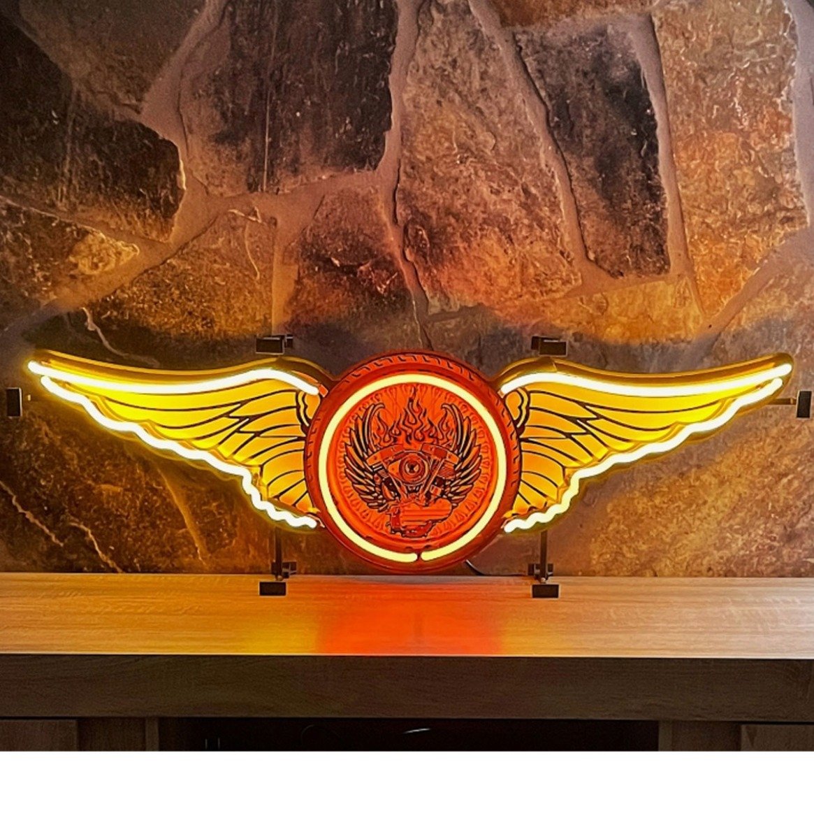 De oranje neonbuizen vormen een opvallend design van vleugels, een krachtig symbool voor vrijheid en avontuur. Met een royale afmeting van 112 x 36 cm is deze neonlamp een echte eyecatcher, ideaal voor elke mancave, garage, showroom of motorliefhebber.