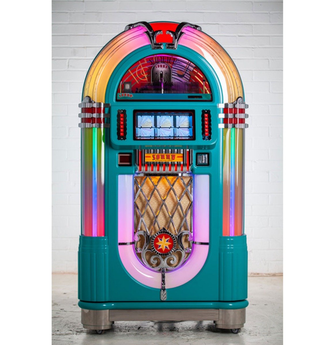 Als je altijd al een klassieke jukebox hebt gewild, maar je zorgen maakt over de hoeveelheid ruimte die ze in beslag nemen, dan heeft Sound Leisure een unieke oplossing! Introductie van de Sound Leisure SL15 Slimline in prachtig Turquoise!, een echte jukebox op volledige hoogte met een afgeslankte kast. Sound Leisure is het enige bedrijf ter wereld dat deze configuratie van klassieke jukebox kan aanbieden dankzij ons unieke, compacte S3U CD-mechanisme, dat 80 CD's en alle essentiële technologie bevat in een ruimte die niet groter is dan een schoenendoos. Binnenin de SL15 Slimline regelt het S3 Unity-jukeboxplatform de show en zorgt ervoor dat alles blijft draaien, zodat u alleen maar hoeft aan te zetten en van de muziek te genieten. Dankzij ons slimme, compacte, draaibare titelkaartdisplay kunt u de volledige trackdetails van alle 80 cd's direct op de jukebox weergeven. Een Bluetooth-ontvanger is standaard gemonteerd, samen met extra in- en uitgangen waarmee de jukebox kan worden aangesloten op andere slimme apparaten. technologieën, zoals Alexa of Sonos. Er kunnen ook extra luidsprekers op de jukebox worden aangesloten en het volume kan afzonderlijk worden geregeld met de afstandsbediening.