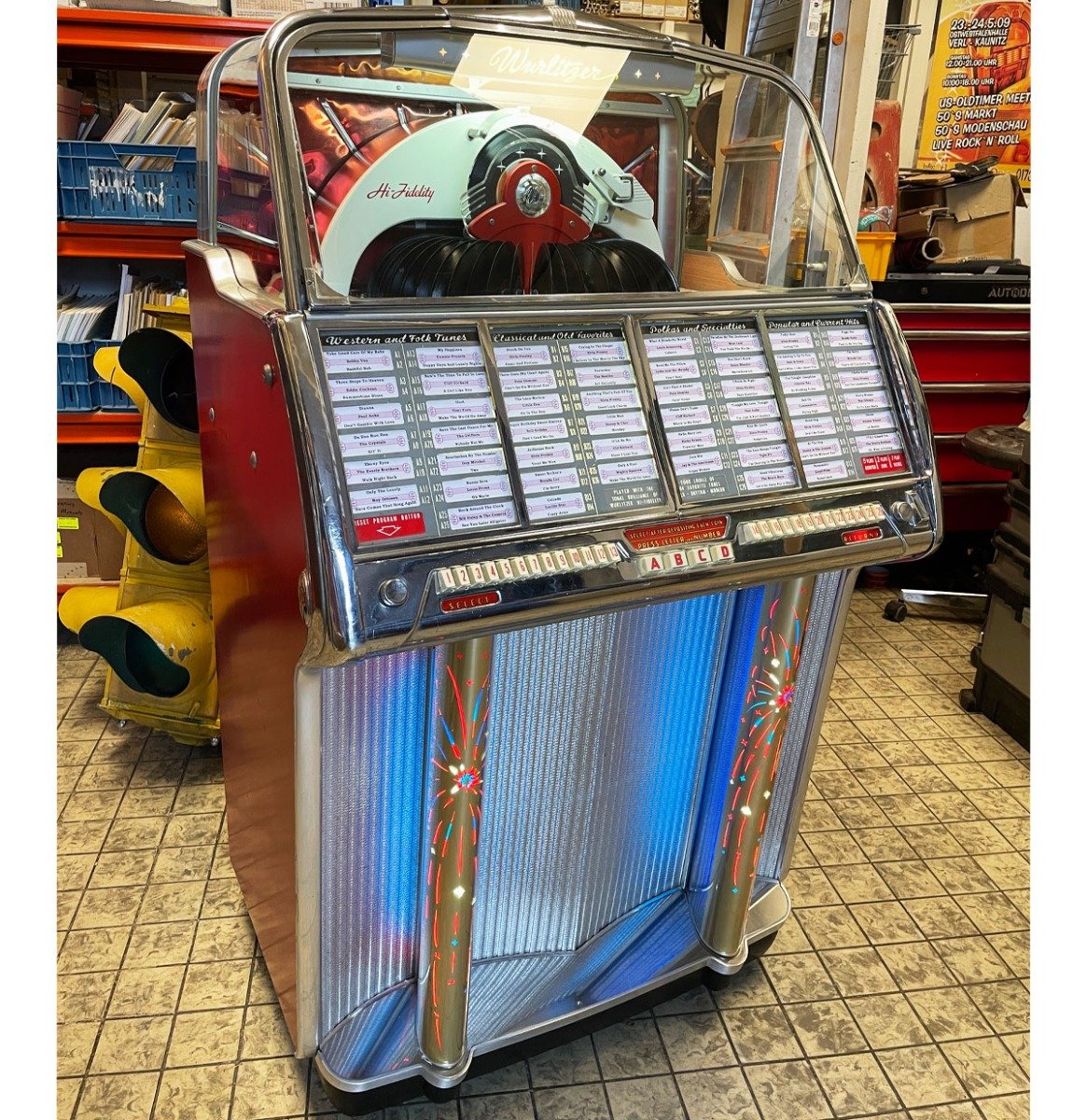 Nu beschikbaar voor een zeer mooie prijs: Een oudere restauratie Wurlitzer 1800 jukebox uit 1955. Een perfect spelende jukebox voor een speciale prijs.